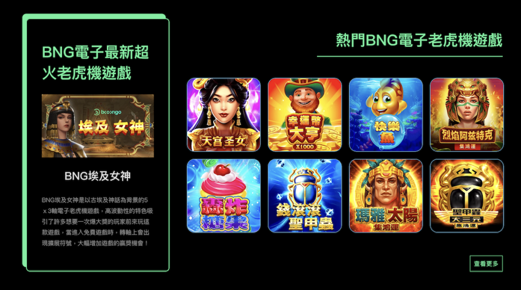 3. 找適合的遊戲 BNG 遊戲種類多,每個主題風格不同,試玩能幫助你挑到最合胃口的一款。