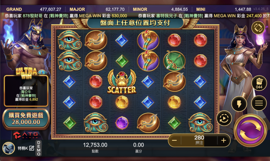 戰神賽特(Book of Dead)是 ATG 出品的經典老虎機,主題圍繞在埃及神話與神秘遺跡探險,畫面超美、音效超沉浸,不管是新手還是老手,戰神賽特都有滿滿的魅力。